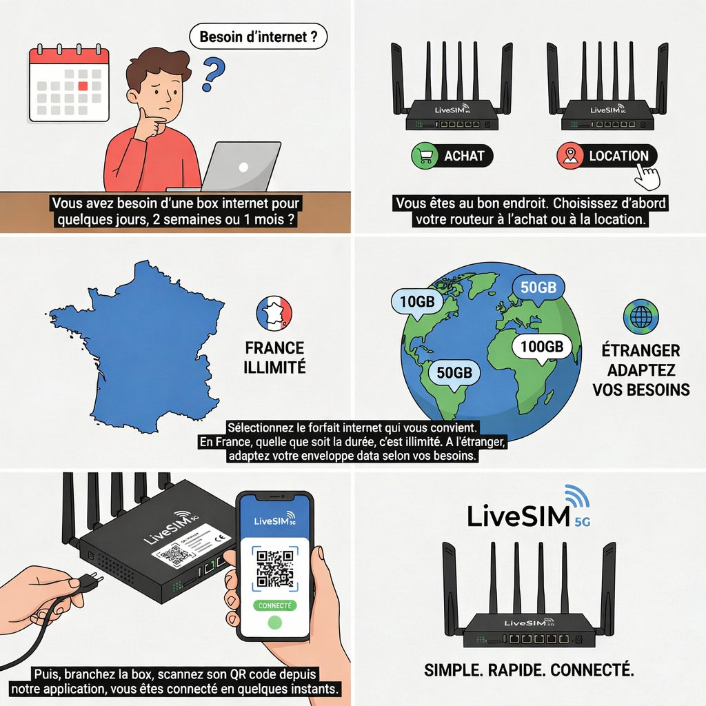 Pourquoi payer un abonnement internet à l’année quand vous l’utilisez seulement quelques jours ou semaines ? Découvrez la technologie LiveSIM : une box internet que vous activez et désactivez à tout moment, en tout lieu, avec votre téléphone via une simple application.